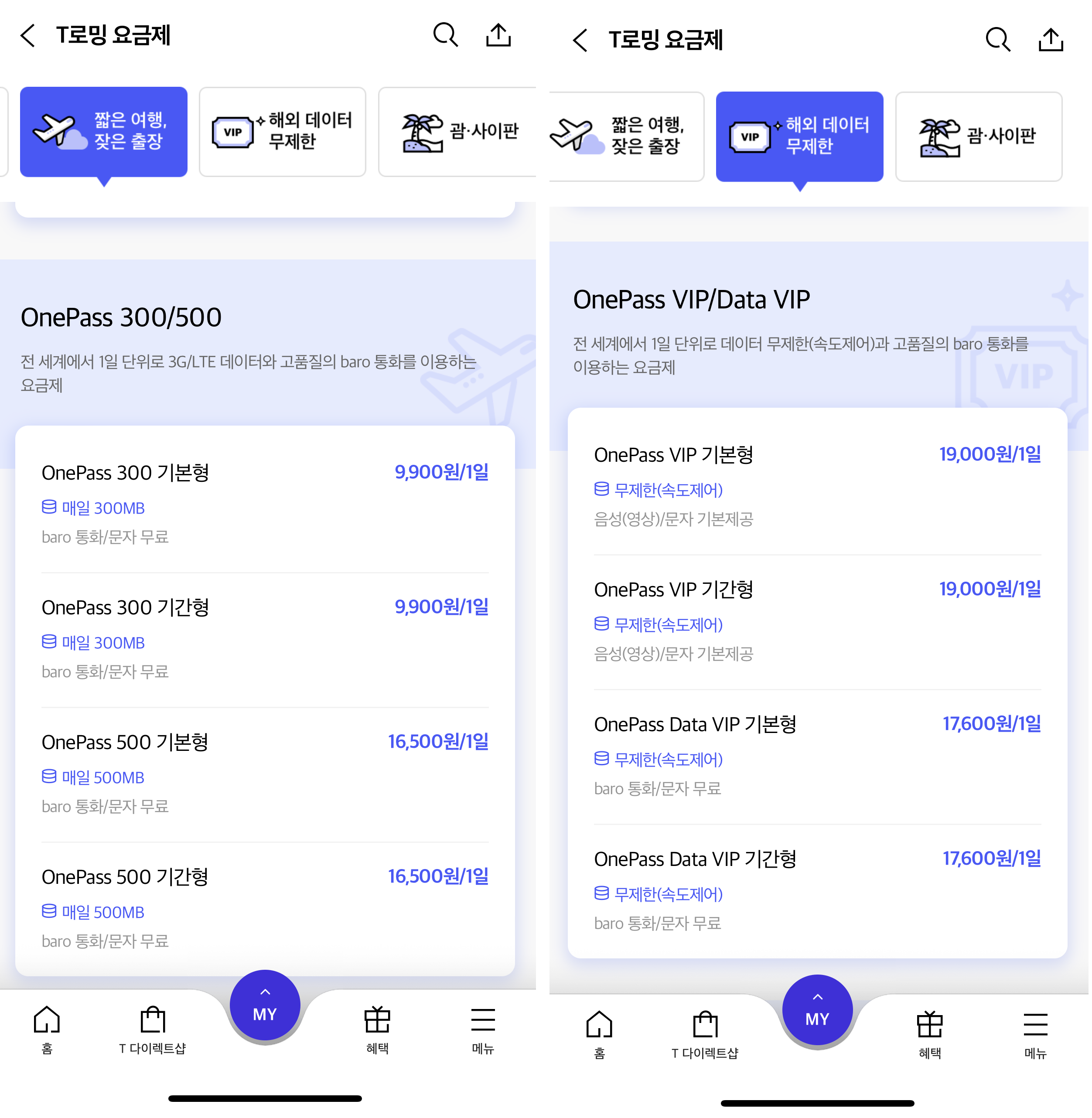 원패스 데이터 VIP는 무제한인데, 이건 요금이 하루에 19000원입니다. 하루만 여행가지 않는 이상은 바로요금제가 가격면으로 유리합니다.