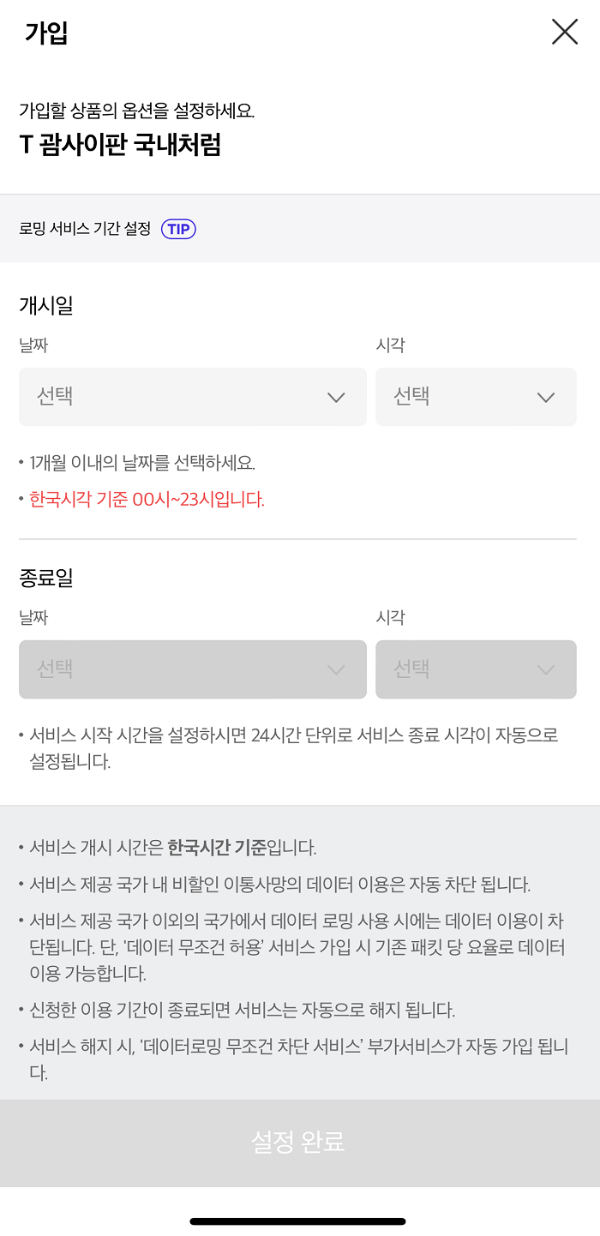 한국시간 기준이니, 개시일은 비행기 떠나는 시간 + 2시간으로 선택해 주시고 종료일은 한국 도착시간으로 해주세요. 어차피 무료니까, 이렇게 설정해 주세요. 비행기 출발이 늦어지는 경우도 있으니까, 넉넉히 해주시는 것이 좋습니다.