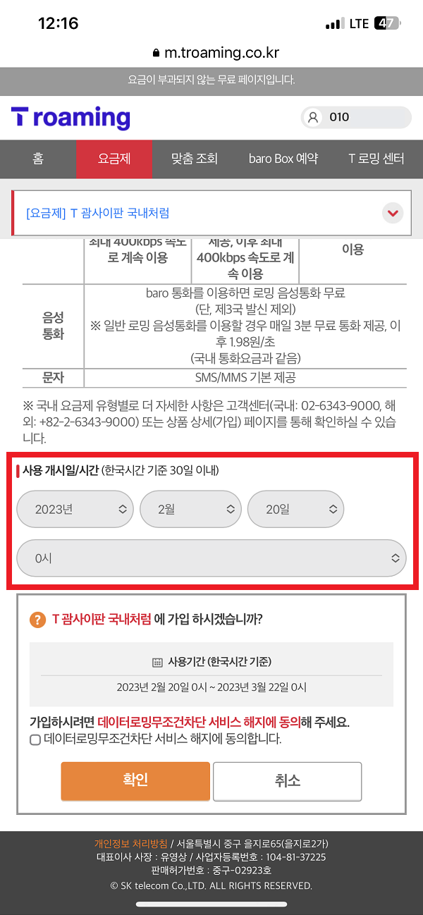 이렇게 가시는 날짜를 선택하시면 됩니다. 설정한 날로부터 한 달간 적용이 되니, 출발일만 선택하세요. 도착하셔도 걱정 없이 티로밍을 이용하실 수 있습니다.