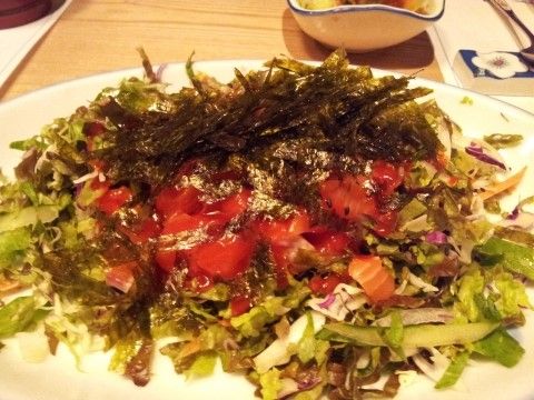 야채와 연어회가 서로 어울려서 새콤한 회무침을 맛볼수 있습니다.
