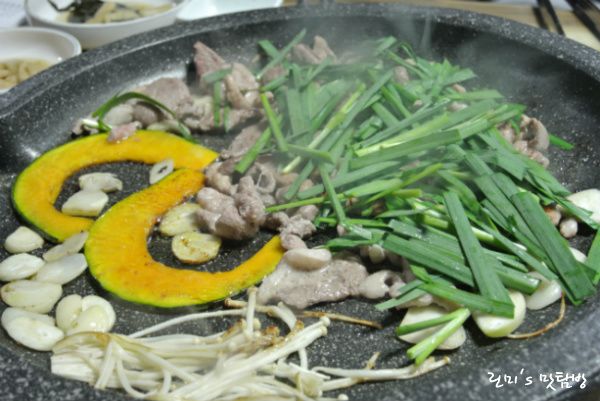오리고기가 거의 다 익어갈때쯤 부추를 위에 뿌려주는 센스! 부추랑 같이 먹으면 맛있다구욧^^