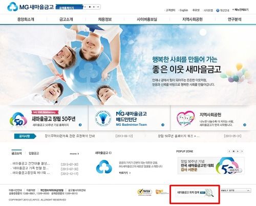 새마을금고 홈페이지( http://kfcc.co.kr) 로 접속을 하면, 메인화면 아래쪽에...