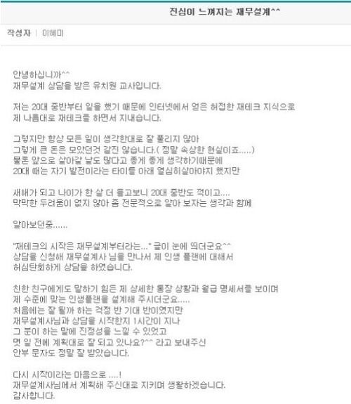 부담없이 전문가에게 재무설계를 받을 수 있을꺼에요.
