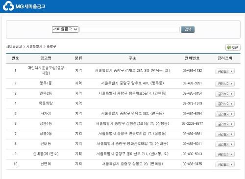 중랑구에 있는 새마을금고 리스트가 뜹니다.